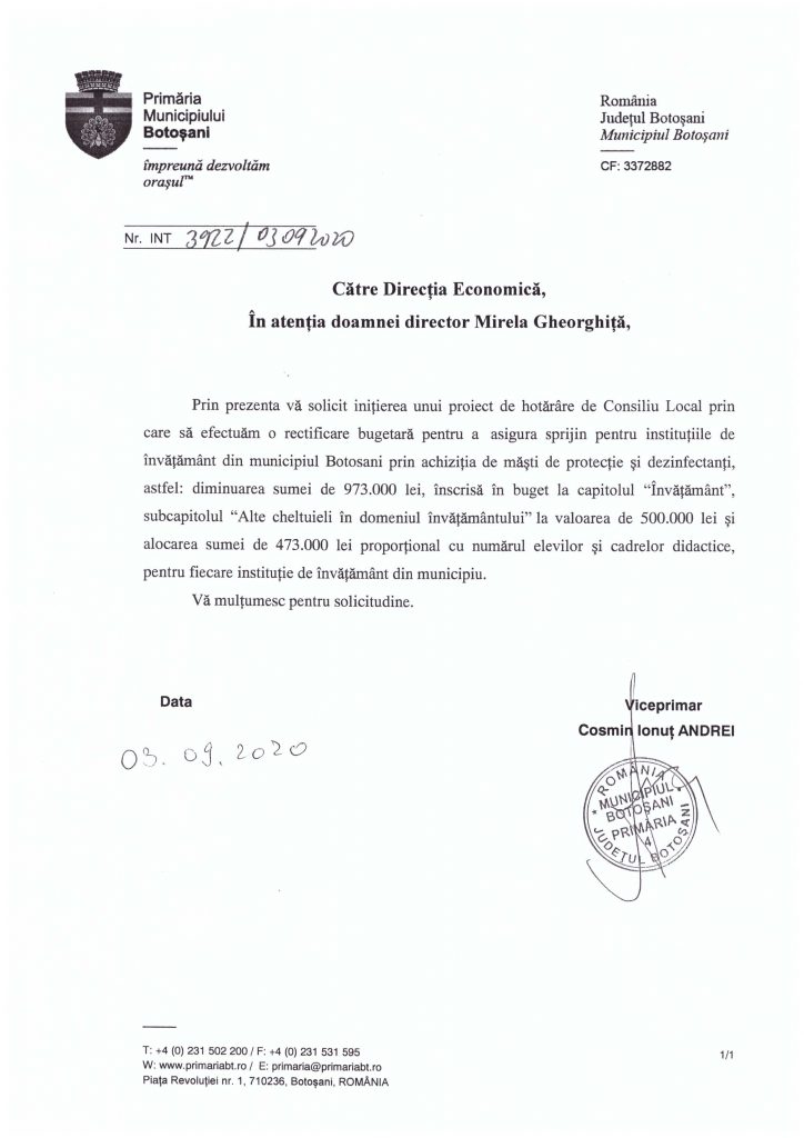 Am discutat cu colegii mei din Consiliul Local și am luat decizia de a solicita inițierea unui proiect de hotărâre de Consiliu Local prin care să efectuăm o rectificare bugetară pentru a  asigura sprijin pentru instituțiile de învățământ din municipiul Botoșani prin achiziția de măști de protecție și dezinfectanți.