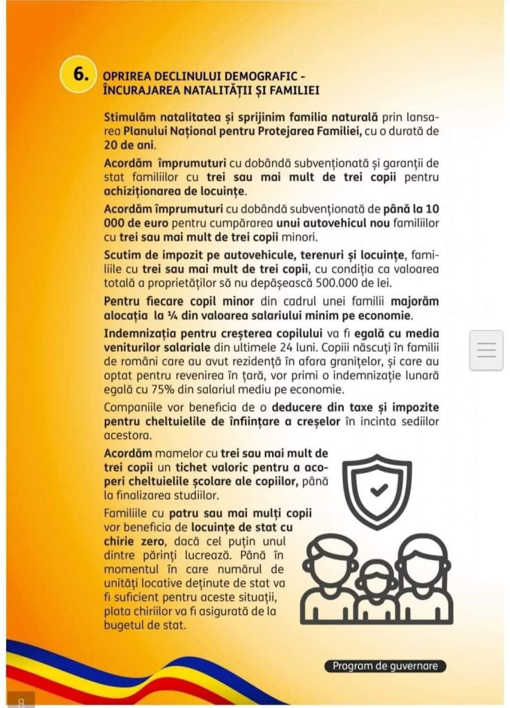 În ceea ce privește angajații și familiile, ne dorim să le oferim o viață mai bună și mai sigură. În guvernarea noastră, salariul minim brut va crește treptat, în decursul primilor patru ani, până la suma de 5.000 de lei. Totodată, ne propunem să reducem sarcina fiscală a angajaților, astfel încât taxele și contribuțiile la sistemul de pensii, asigurări sociale și sănătate să nu depășească 25% din salariul brut pentru primele 5.000 de lei. Acest lucru va permite românilor să dispună de mai mulți bani în buzunar pentru a-și asigura traiul decent.