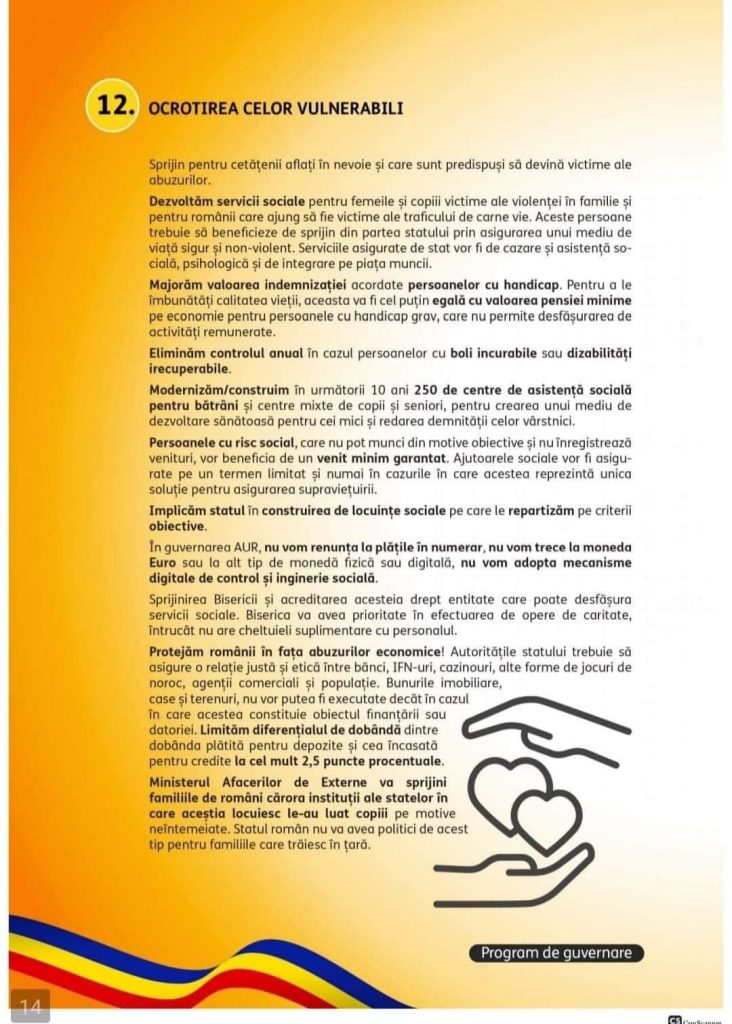 Am avut ocazia să dezvăluim programul nostru de guvernare intitulat „Reconstruim România – Programul de guvernare AUR în 15 puncte”. Acest document va fi supus acum dezbaterii publice și va fi discutat cu specialiști și parteneri sociali în toate reședințele de județ, precum și în comunitățile de români din diaspora. Împreună cu experții și românii implicați, am identificat propunerile și soluțiile care vor fi reflectate în documentul final rezultat în urma acestor dezbateri.