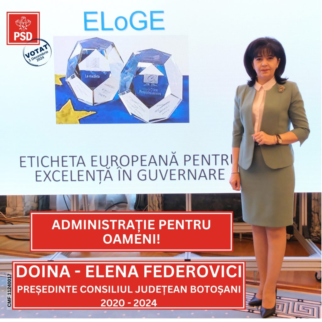 Echipa PSD a pus pe primul plan dezvoltarea județului și promovarea acestuia la nivel european. Ceea ce am făcut în ultimii patru ani a fost doar începutul unui drum care trebuie să continue și de aceea îi rog pe botoșăneni să aibă încredere în echipa de parlamentari PSD și să-i voteze pe 1 decembrie. Faptul că am pus județul pe drumul bun, pe calea dezvoltării, nu o spunem noi, ci reprezentanții celor mai importante foruri europene. Consiliul Europei ne-a acordat prima etichetă EloGE din România, adică Eticheta Europeană pentru Excelență în Guvernare, iar în cadrul Săptămânii Europene a Regiunilor de la Bruxelles, echipa pe care o conduc a fost invitată, în ultimii doi ani, să prezinte exemple de bune practici în ceea ce privește proiectele europene implementate”, a declarat Doina Federovici, președintele PSD Botoșani.