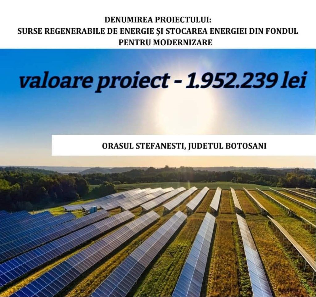 Am semnat Contractul de finanțare pentru realizarea unui parc fotovoltaic în Ștefănești. Contractul a fost semnat cu dl. Sebastian Burduja, Ministrul Energie. Proiectul face parte din Programului „Fondul pentru Modernizare”, Apelul – „Sprijinirea investițiilor în noi capacități de producere a energiei electrice produsă din surse regenerabile pentru autoconsum pentru entități publice”. (Finanțare fonduri europene nerambursabile) Parcul fotovoltaic va fi construit în Ștefănești.(termen până în 31.12.2026) Va avea o suprafață de 5000 m². Energia electrică anuală produsă de parcul fotovoltaic va fi folosită integral ca autoconsum”, a precizat Florin Buțura, primarul orașului Ștefănești.
