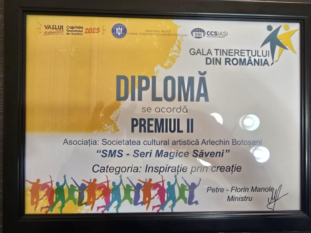 Festivalul de artă „SMS – Seri Magice Săveni”, organizat de Asociația „Arlechin” Botoșani, a fost desemnat finalist la Gala Tineretului din România 2025, la secțiunea „Inspirație prin creație”, eveniment național organizat de Ministerul Muncii, Familiei, Tineretului și Solidarității Sociale, care a avut loc la Vaslui, pe 25 octombrie 2025.