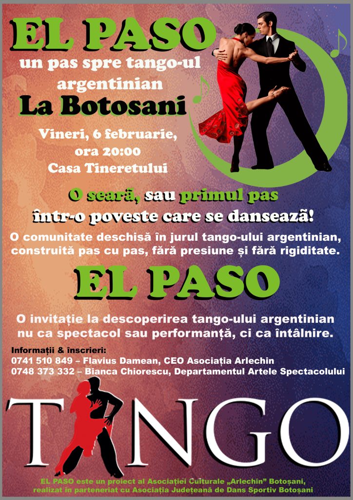 La Botoșani, în spațiul Casei Tineretului, EL PASO este noul proiect de tango argentinian al Asociației Cultural-Artistice „Arlechin” Botoșani, care pune accent pe esența acestui dans: mersul, conexiunea, ascultarea și prezența. Tango-ul nu începe cu figuri complicate și nu cere experiență. Începe cu un pas făcut împreună.