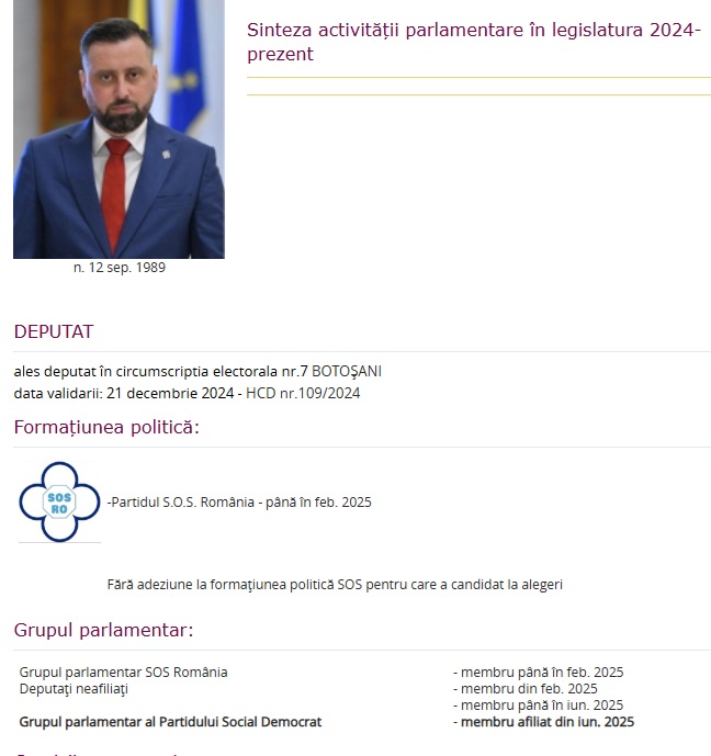 SOS i-a oferit rampa de lansare și ieșire din anonimat. A fost ales deputat la Botoșani, deși nu știa nici unde este aces județ. După ce s-a văzut deputat, a trădat. A părăsit partidul. A doua oară a trădat grav față de botoșăneni în cursul acestui an. La constituirea bugetului de stat. Atunci a primit o anumită sumă de bani pe care o putea direcționa spre diverse nevoi ale județului. Dar el, deputatul cu viclenia la rever, a direcționat banii spre Constanța.